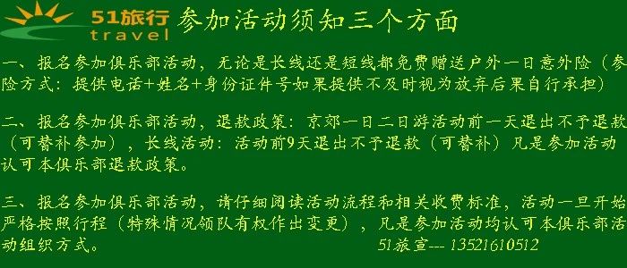 ★★注★★:全程正规旅游大巴车,根据人数定车型。以上时间为不塞车的预计时间,如果活动过程中因天气,塞车,修路需要绕道而行等原因导致行程延误,领队有权对活动进行调整,领队有挑选队员的权利。