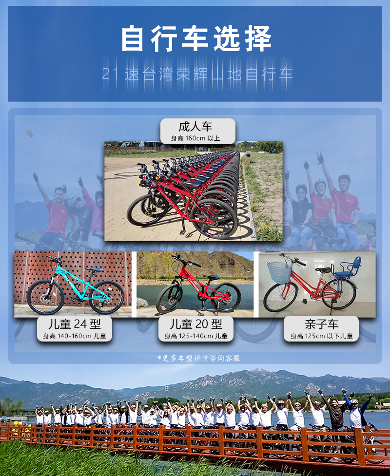 2)自行车:延庆正规骑游公司提供专业骑游用山地自行车及骑行安全头盔 (儿童用车请报名时务必说明身高);