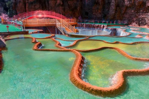 七彩池是由大大小小的水池组成,所有的池水来自同一条瀑布,水流到各个水池里,颜色却不同了。池边由金黄色的石粉凝结而成,像一圈圈彩带,把大大小小的水地围成各种不同的形状,有像葫芦的,有镰刀的,有像月牙的,有像盘子的,有像莲花的……