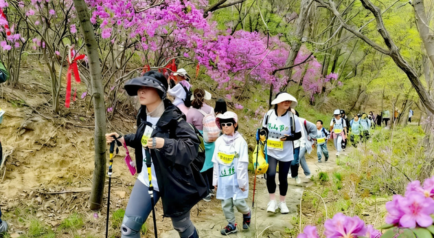 人们在山间行走,仿佛置身于一幅生动的春日画卷中。
