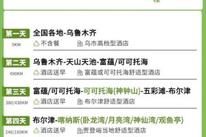 4:全程所有景点区间车不含。新疆的景区交通车价格变动较大,故全程区间车费用自理,参考价格:天山天池区间车60元/人、可可托海区间车26元/人、喀纳斯一进区间车70元/人、贾登峪-禾木区间车50元/人、禾木景区-禾木村区间车52元/人、世界魔鬼城小火车20元/人、赛里木湖区间车75元/人、喀拉峻草原区间车70元/人、那拉提空中草原区间车40元/人、巴音布鲁克区间车75元/人、库木塔格沙漠小火车30元/人(以景区最新价格为准)。