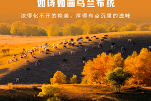 乌兰布统的秋天,是大自然奉送的美丽,是那种浓得化不开的艳美,是那种厚得有点沉重的滋味。牧人们悠扬的吆喝,羊群赶路时默默的神情,以及海口碗里浓浓的奶酒,篝火堆里发着膻香的羊肉,还有那淡极了味儿的筱面窝窝……都会给人留下难忘的印象。