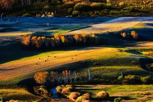 坝上草原——乌兰布统大草原,每年从9月到10月上旬,树叶开始大量地变色,这期间,各种树木的叶子,有的金黄、火红、翠绿,五彩缤纷。特别是白桦树的叶子。成群的牛羊,在夕阳的映照下,如同撒落在草原的珍珠。