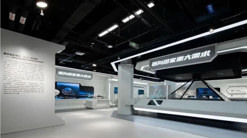 校史馆一层大厅,为科技成果展,主要展示为“面向国家重大需求”、“面向经济主战场”、“面向人民生命健康”、“面向世界科技前沿”、 “一流理科,精品文科”、“科研育人“六大主题,不仅是北航近年来科技创新成果的集中展示,也是北航新时代深度参与科教兴国战略,服务第一个百年奋斗目标建设的精彩答卷。