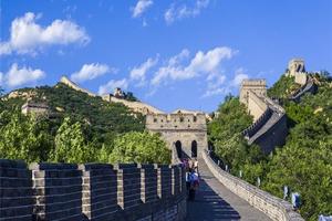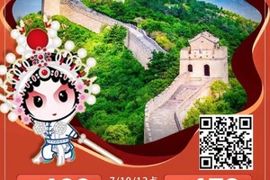 10:00 游览世界八大奇迹 之一的【八达岭长城】(约2.5小时),体会“不到长城非好汉的”的豪迈。万里长城象一条巨龙盘踞在祖国的北面,绵延数万里,纵 贯两千年,雄伟壮观,气势磅礴。八达岭长城,更是“奇迹”中的经典,登上长城,脚下的崇山峻岭,蜿蜒起伏,四季风光各不相 同:春天野花竞开,夏季绿色满眼,秋天层林尽染,冬来雪域莽莽,景色令人叹为观止。(游览时间约2.5小时,交通辅助工具八达岭缆车或滑车往返140元/人,自愿乘坐!)