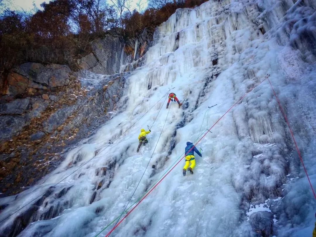 我们会在每周末安排攀冰体验活动,适合初学者参加,欣赏凝结的冰瀑,体验攀冰运动的乐趣。体验活动会讲解攀冰装备知识、常用绳结、基础攀冰技巧,并用顶绳攀登的方式来体验。