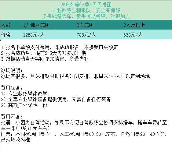 强度等级:专业攀冰教练老师教学,无论男女老少,有无需户外经验都可参加;