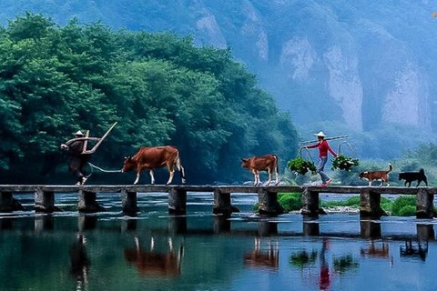 可徒步进入,而后乘坐木船,驶入楠溪江源头,水质清澈见底,能看到鱼儿成群熙熙;峡谷中鸟鸣声不绝于耳,仿佛回荡在河谷中美妙的音乐,一幅充满诗情画意的田园风光图景。
