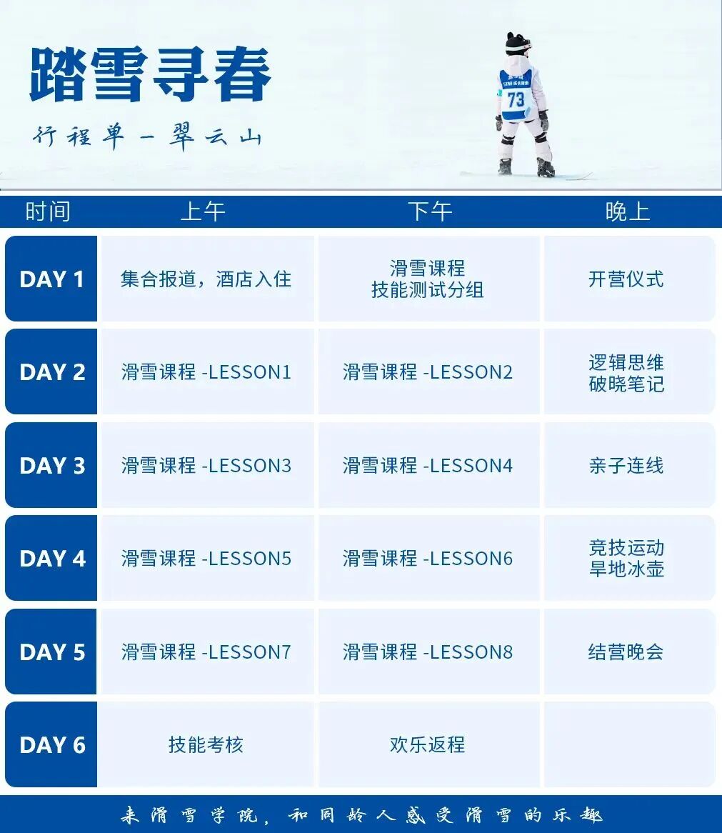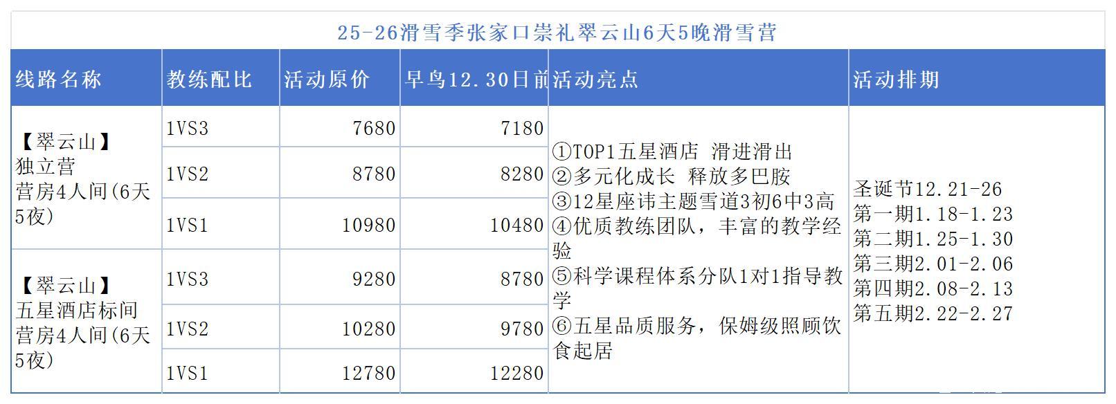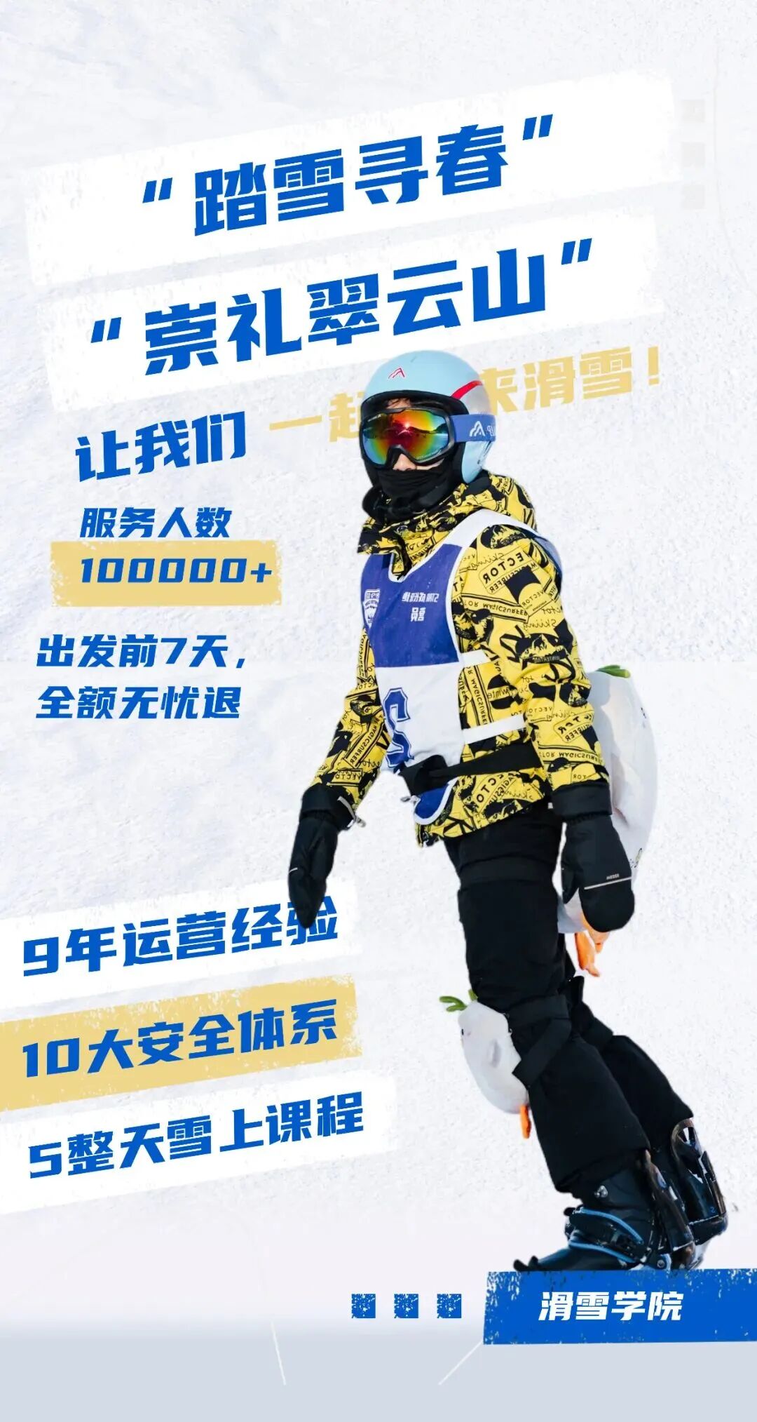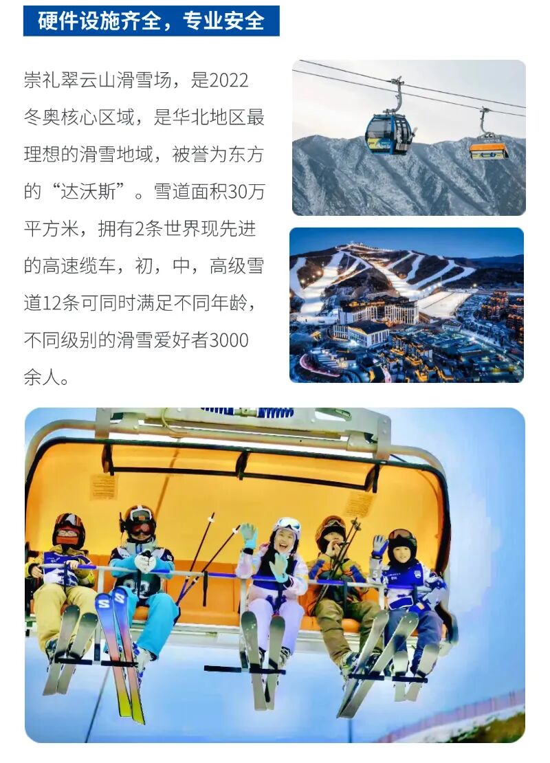 优质专业:五星品质,国际装备【踏雪寻春】2026年滑雪学院第三站位于崇礼翠云山滑雪场。是2022冬奥核心区域“中国雪都”崇礼。这里是华北地区最理想的滑雪地域,东方的“达沃斯”,专业的雪道,优质的粉雪,自然成了雪友们向往的所在。