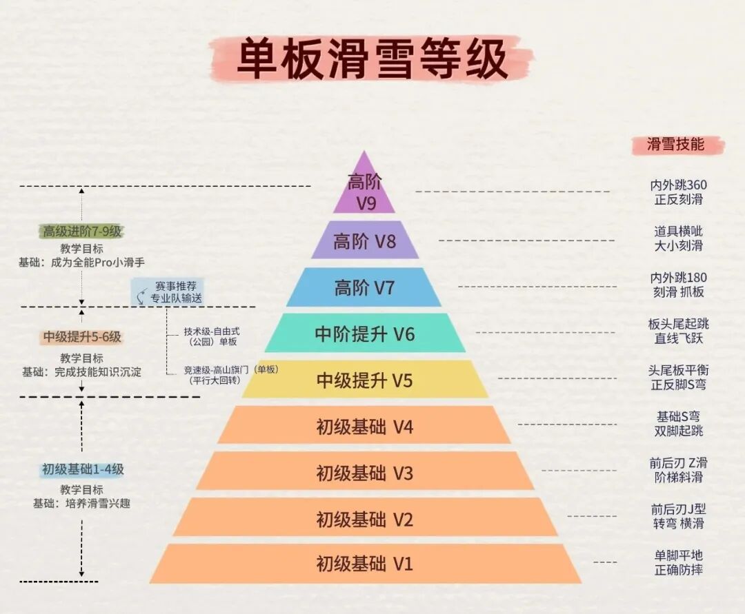 单板1-4级和双板1-5级为初级基础教学阶段,本阶段为滑雪学习基础阶段,以培养兴趣、良好滑雪习惯和标准滑雪动作为主。