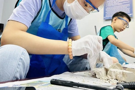 在老师的指导下,用专业工具一步步敲开封层,扫清附着的灰尘,亲手挖掘一枚属于自己的菊石。