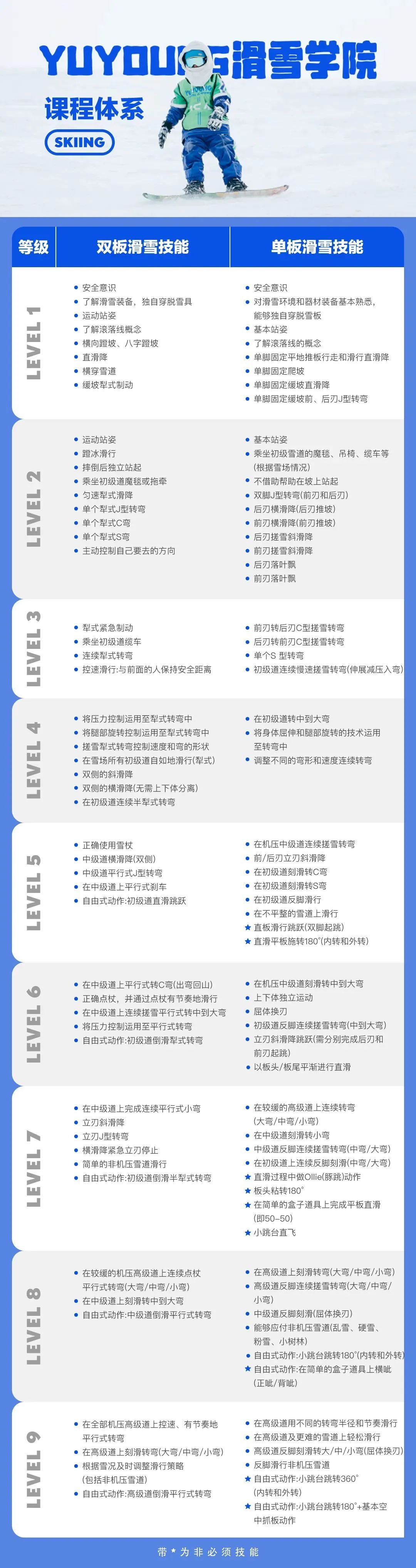 结合全球各大滑雪体系,以「北京大众滑雪锻炼等级标准」为总纲,打磨出了更适合中国青少年体制的1-9级进阶式教学体系,高效培养滑雪技能,专业学习考核。