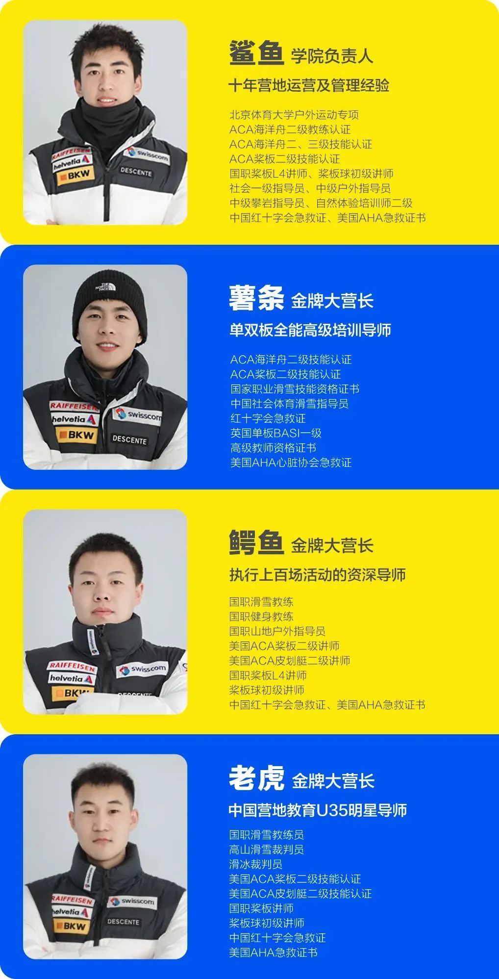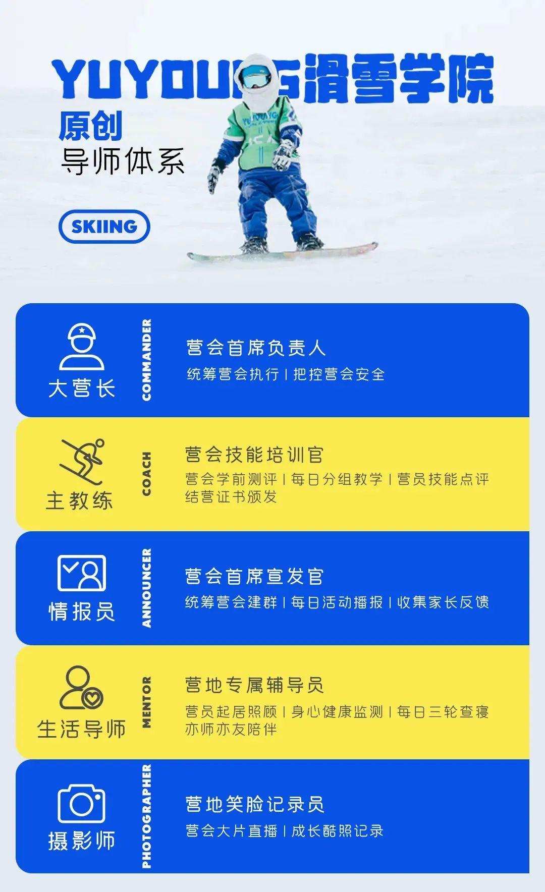 YUYOUNG滑雪学院,优选国内顶尖体育高校人才,每年多轮国内外技能培训、营地教育峰会讨论,打造出一支「集颜值与实力于一身」的明星导师团。