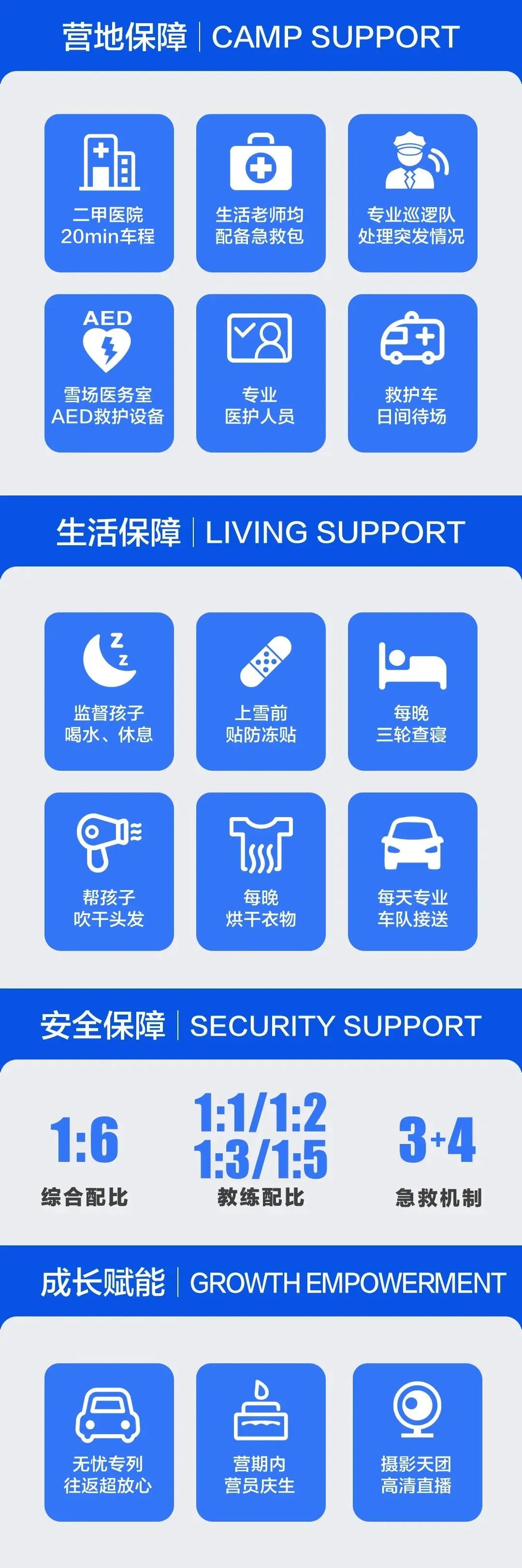 营地从场地保障、安全保障、生活保障、成长赋能四大方面,为学员保驾护航。