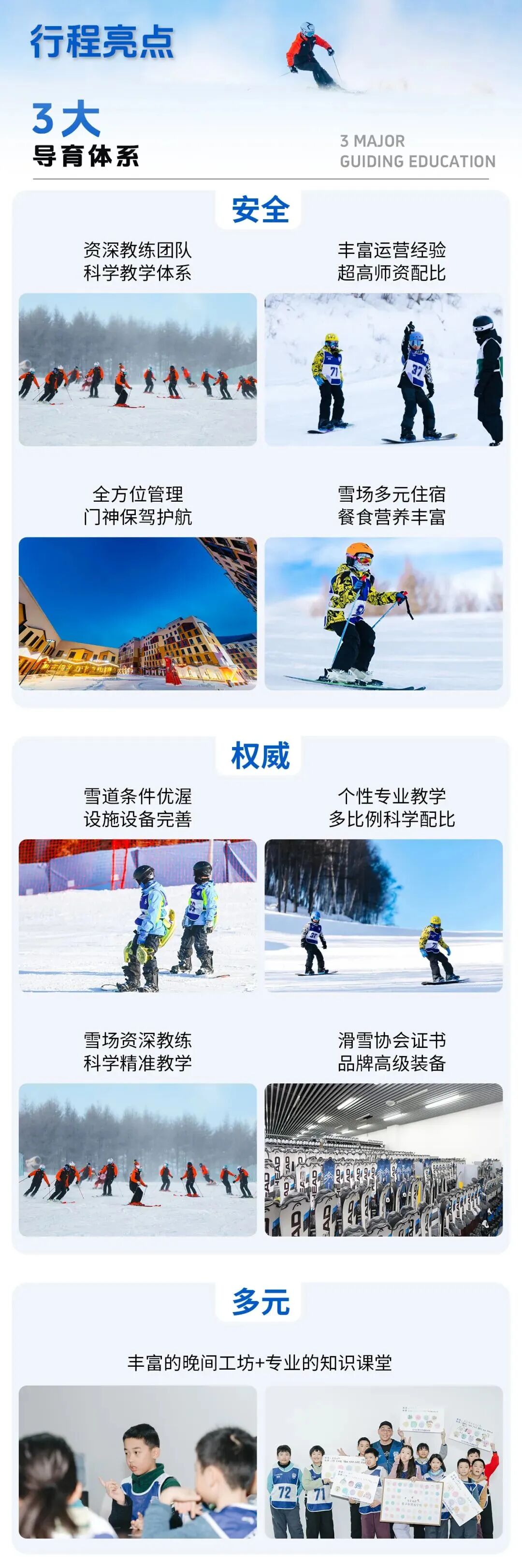 课程体系参考大众滑雪等级和新西兰滑雪教学双体系优势,推出趣味性闯式课程,形成3阶9级滑雪基础教学体系及专项进阶体系,为营员定制适合的教学方案, 更专业,更有针对性!