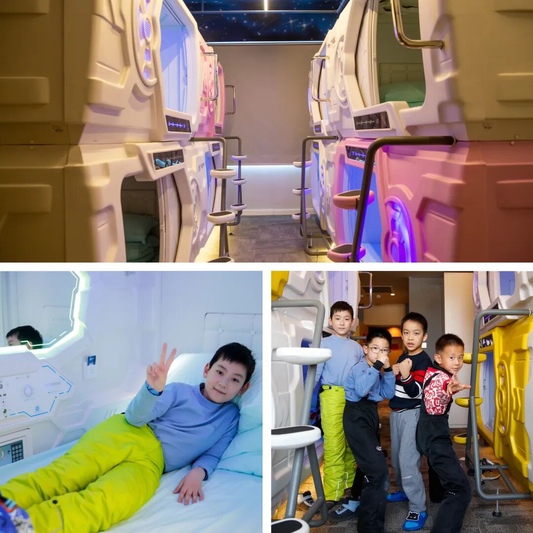 冠军级顶配!在七山站,我们为孩子准备了万达锦华酒店和星空胶囊营房两种住宿方式,真正做到Ski-in Ski out,出门一分钟上雪道。