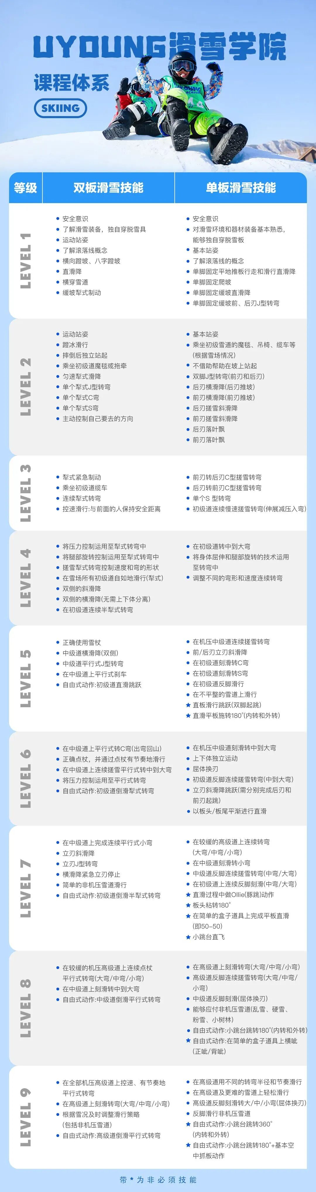 UYoung青少年滑雪学院,结合全球各大滑雪体系,以「北京大众滑雪锻炼等级标准」为总纲,打磨出了更适合中国青少年体制的1-9级进阶式教学体系,高效培养滑雪技能,专业学习考核。