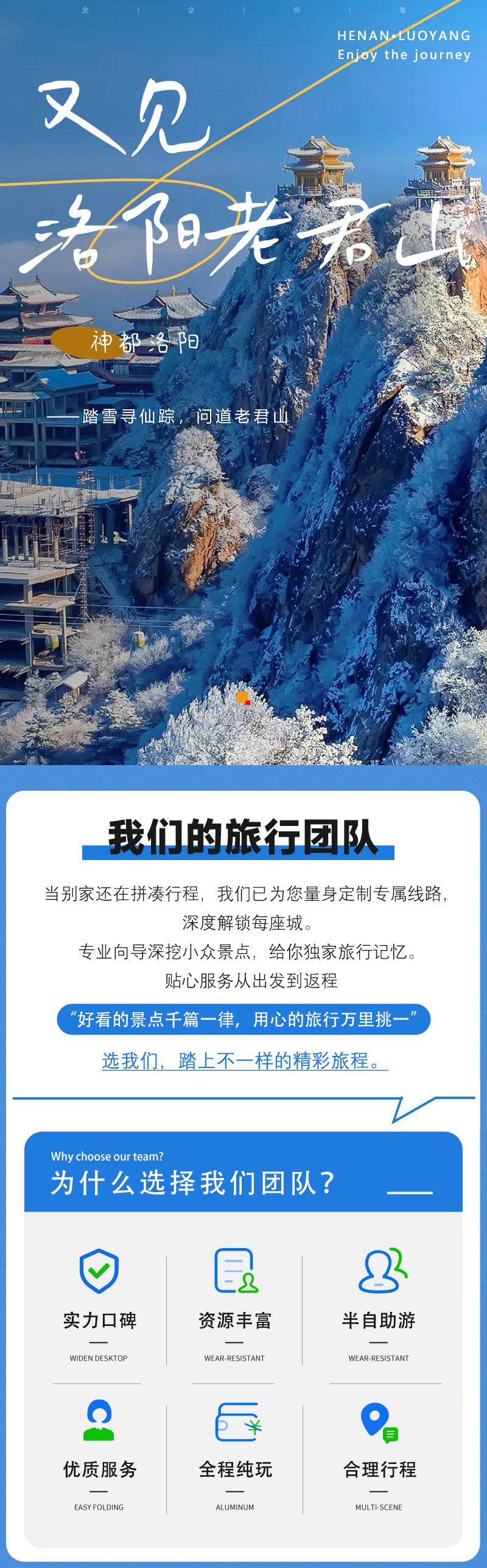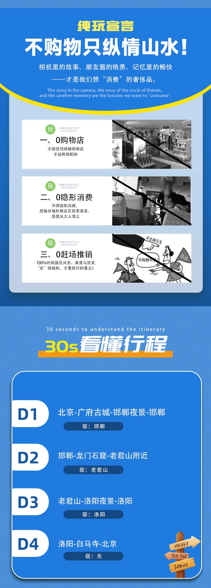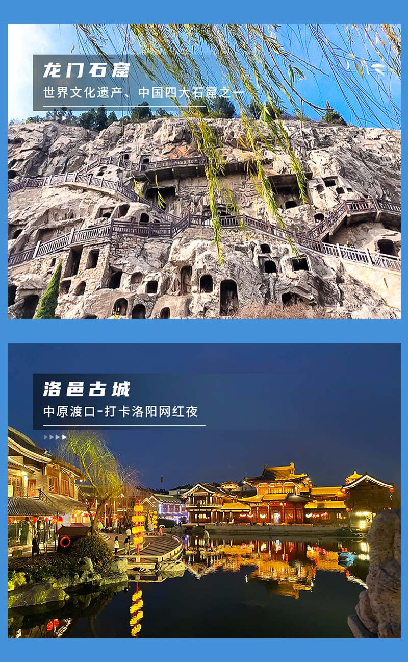 2)门票:老君山门票+中灵往返索道团体220元,龙门石窟90元自行网上预约,白马寺35元;价格供参考,以景区实际政策为准。