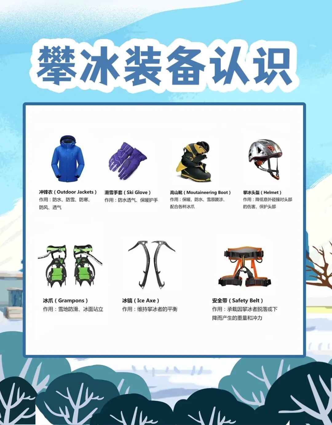 全程活动都是在有攀冰装备(冰镐、冰爪、高山靴、安全带、头盔、手套、绳索等)和专业教练的保护下进行,保证大家的安全!